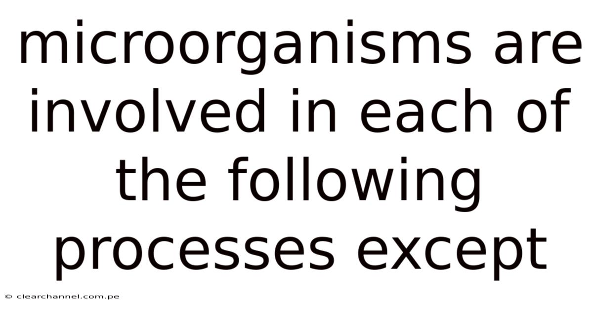 Microorganismsare involved in each of the following processes except photosynthesis in higher plants, decomposition of organic matter, nitrogen fixation, fermentation, bioremediation of pollutants, production of antibiotics, and formation of soil structure. This statement appears in many biology textbooks and exam questions, prompting students to identify the process that does not rely on microbial activity. Here's the thing — in this article we will explore the ecological roles of microorganisms, examine each listed process, and clearly pinpoint the exception. By the end, you will have a solid understanding of why certain biochemical pathways are exclusive to multicellular organisms and how microbial contributions shape our planet.