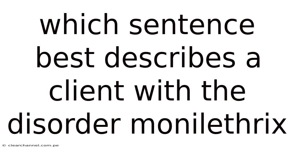 A sentence that best describes a client with monilethrix might be: "The client presents with brittle, beaded hair that breaks easily, resulting in patchy hair loss, particularly on the scalp and eyebrows, consistent with a diagnosis of monilethrix." This description captures the hallmark features of the disorder, including the characteristic beaded appearance of the hair shaft, the fragility of the hair, and the typical areas of hair loss Which is the point..